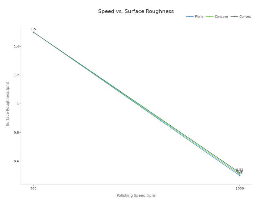 Tests show that raising the polishing speed from 500 rpm to 1000 rpm can make the surface three times smoother after 30 minutes. This means you get a better finish faster. The chart below shows how surface roughness goes down as speed goes up: